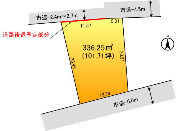 北側:市道-2.4~4.5m(道路後退要)、南側:市道-5.0m